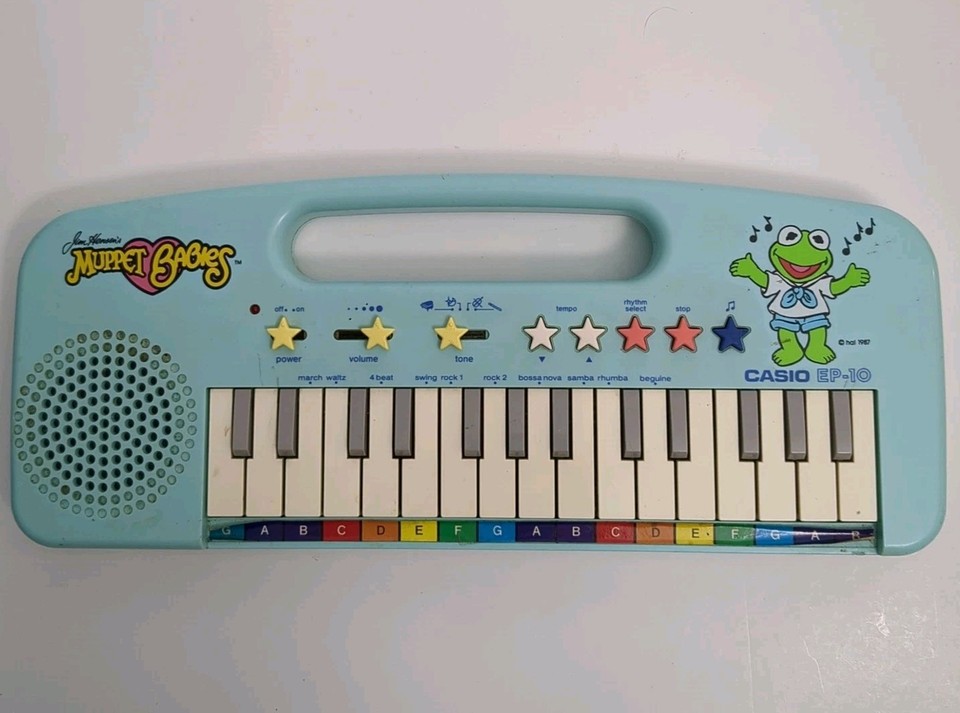If you know me, you know I have an obsession with vintage keyboards, which I avidly collect. My favorite ones are even hanging on the wall just next to me as I type this, proudly displaying my love for all things synthy and awesome. This Muppet Babies keyboard from 1987 has a lot to do with that, being one of the earliest musical toys I can remember having.