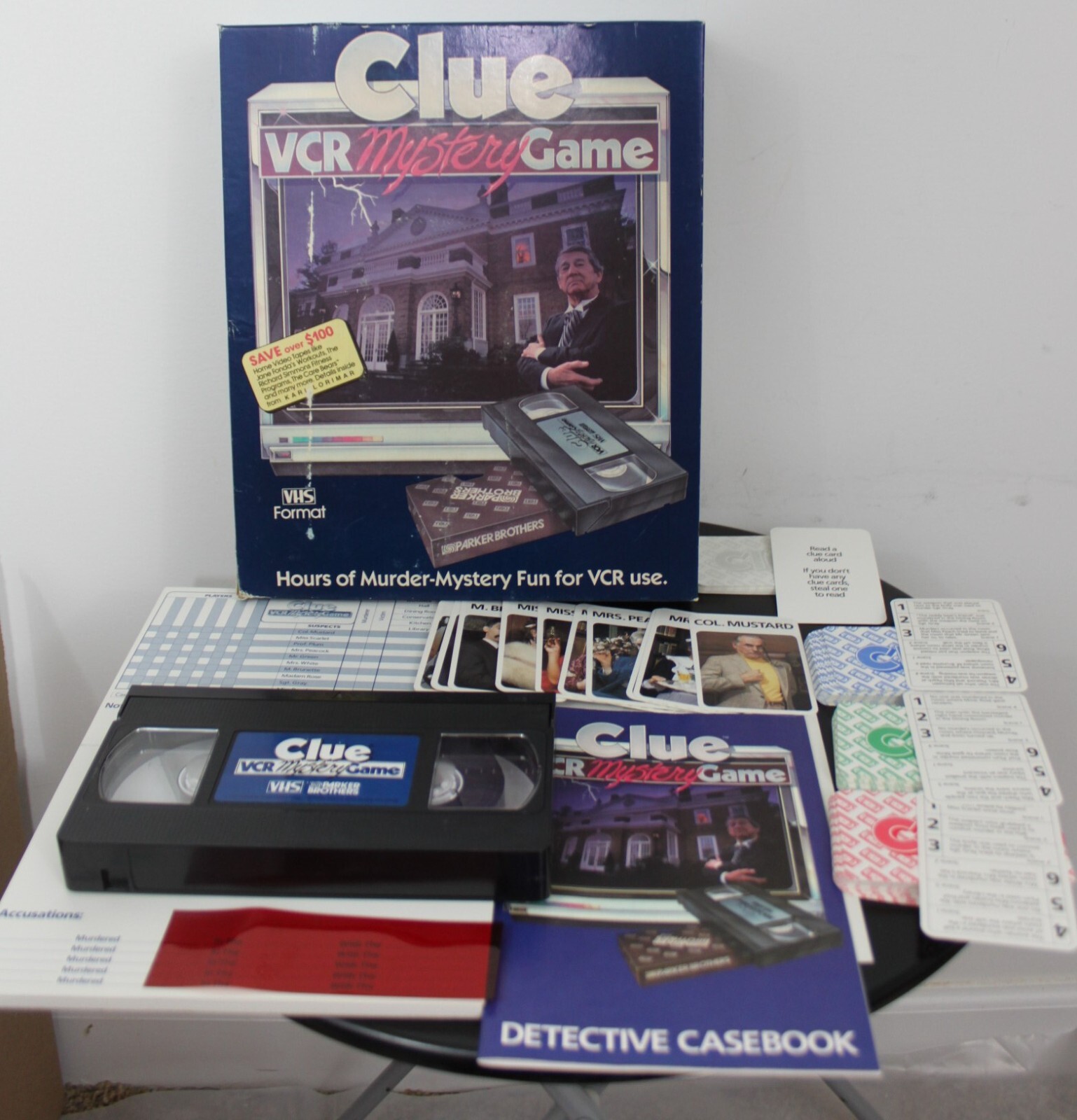 Launched by Parker Brothers in 1985, the game came in a big box that contained a regular Clue-style board, cards, tokens, and a VHS tape. It was marketed as a more immersive, cinematic version of the original. All the familiar characters from the original Clue game are present, along with a helpful butler named “Didit” (get it?) who teaches you how to play the game and solve the mystery.