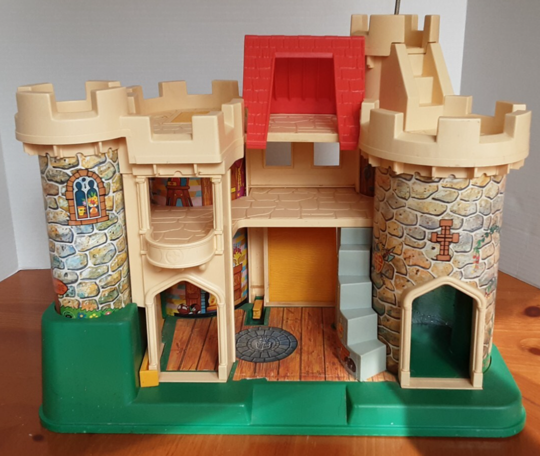 Grandma’s basement in particular was a treasure trove of vintage toys, as she had amassed quite the collection from previous generations by the time I came along. In her basement rec room, with its shag carpet and wood-panelled walls, you could find such treasures as vintage Barbie dolls that belong to my mom and her sisters, board games such as Twixt and the The Six Million Dollar Man, tin cans full of Tiddlywinks, electronic football, and more. But the piece de resistance was this Fisher Price Castle set that belonged to my youngest aunt when she was a little girl.