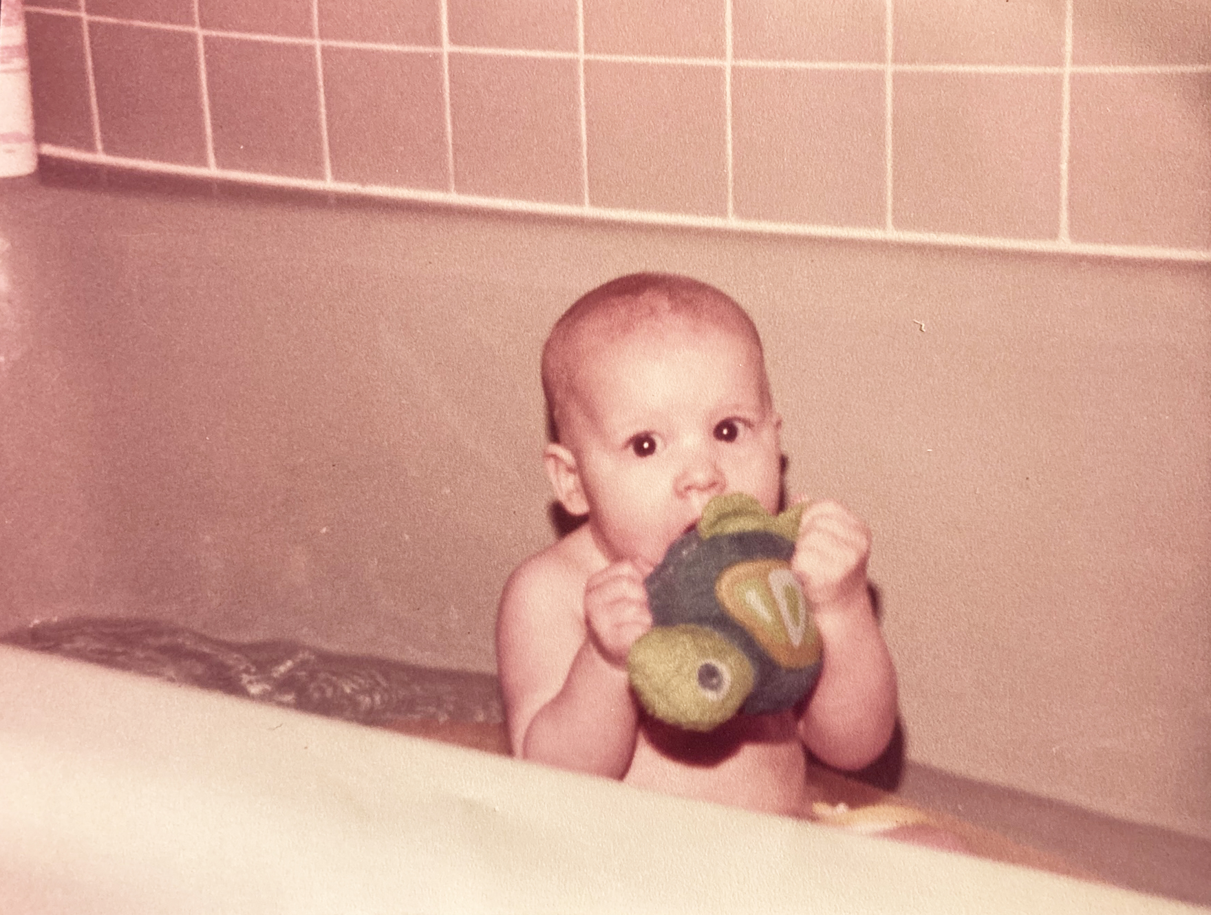 Me listening to my Fisher Price Tape Recorder while I play in the sandbox that my dad built.